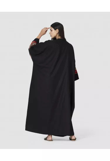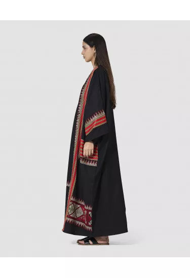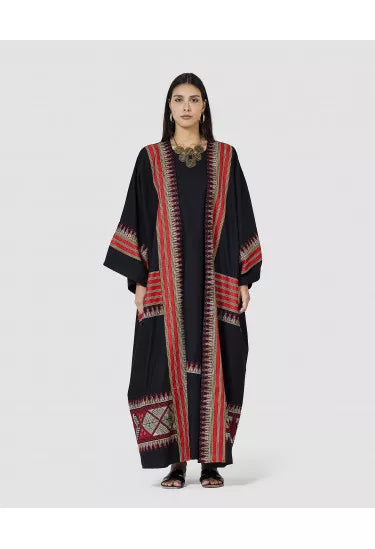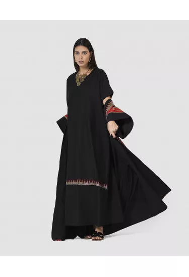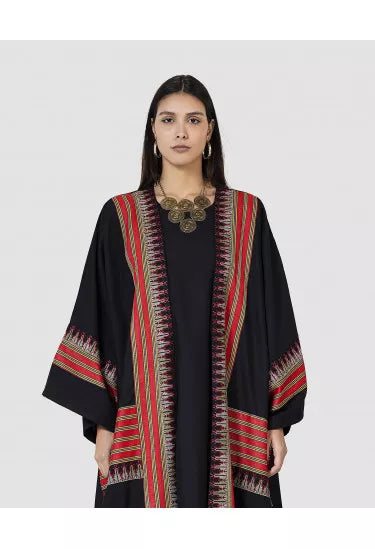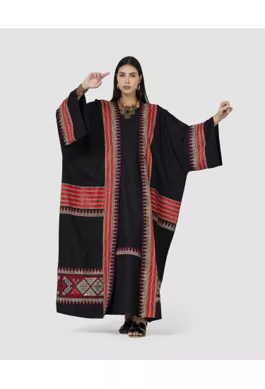 ارتقي بإطلالتك مع هذا البشت الأسود الراقي المكون من قطعتين، المصمم خصيصًا ليجمع بين الوقار والفخامة في كل تفصيلة. خطوط التطريز المستوحاة من النقشات التراثية بالأحمر والذهبي تمنحك حضورًا آسرًا يأسر الأنظار ويبرز جمالك العربي الأصيل.