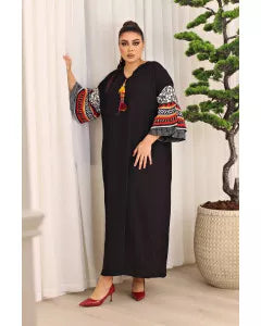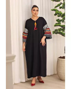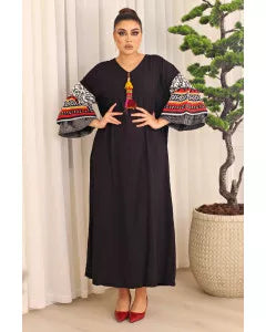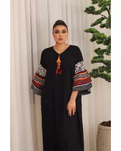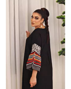 دراعة من الكتان القطنى الأنيق باللون الأسود مع تفاصيل تراثية جذابة على الأكمام والياقة. تتميز بتطريز ملون مستوحى من الفلكلور العربي، مع شرابات تضيف لمسة حيوية وجمالية. القصة الفضفاضة تضمن الراحة والأناقة، مما يجعلها مثالية للمناسبات اليومية والمظهر العصري المميز.