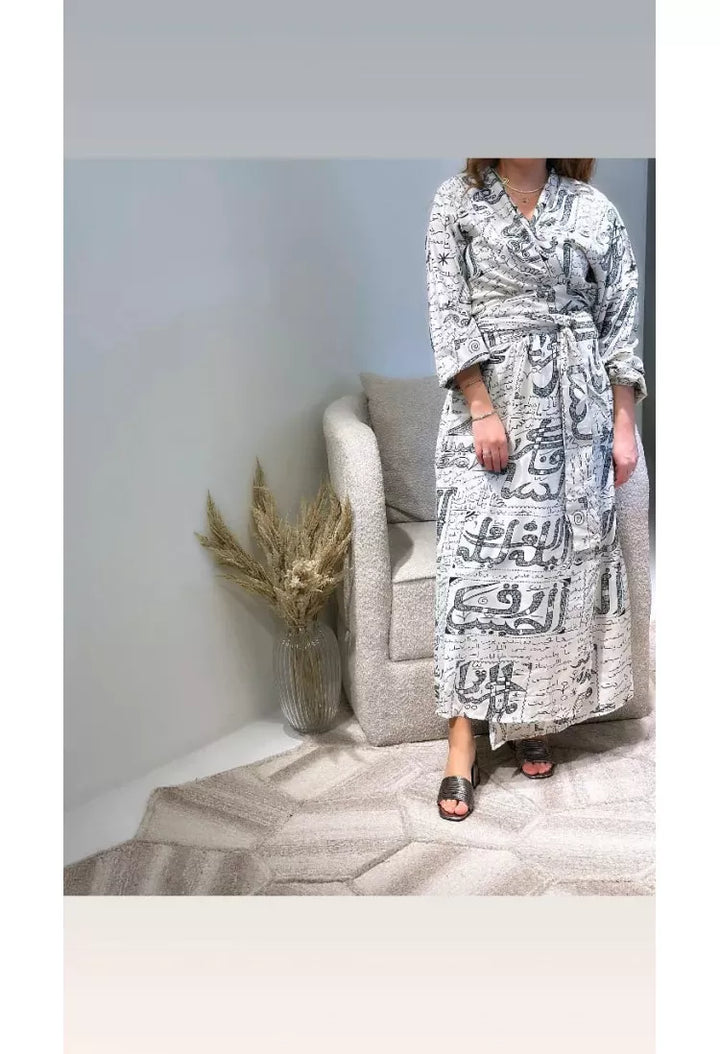 تميّزي بإطلالة غير تقليدية مع دراعة فنية بطبعة مستوحاة من الحرف العربي، تجمع بين الطابع الشرقي الكلاسيكي والستايل العصري الجريء. مصممة من خامة مريحة بملمس ناعم، مع قصة محتشمة وفضفاضة تضيف فخامة وبساطة في آنٍ واحد.