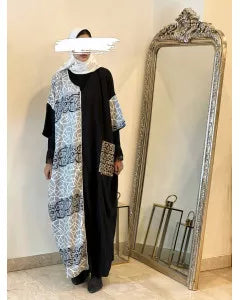 نصف بلون أسود ملكي، والنصف الآخر بنقشة هندسية متداخلة بدرجات الأبيض والرمادي، تمنحك توازن أنيق بين الكلاسيكية والستايل العصري. الجيب الأمامي المميز بتطريز تقليدي يضيف عنصرًا من الأصالة والتفرّد.