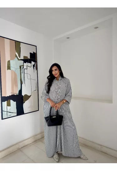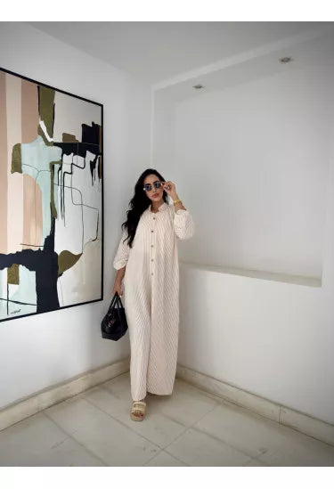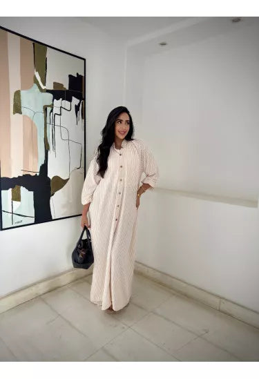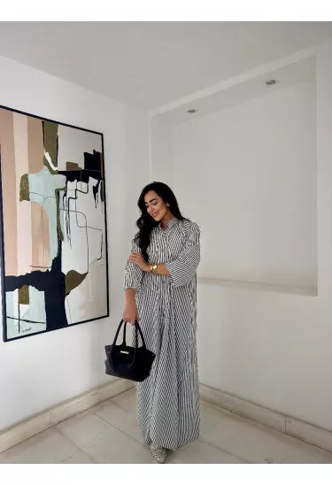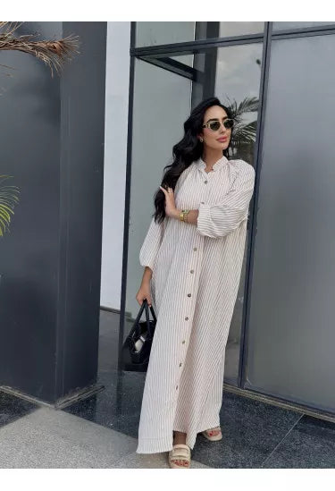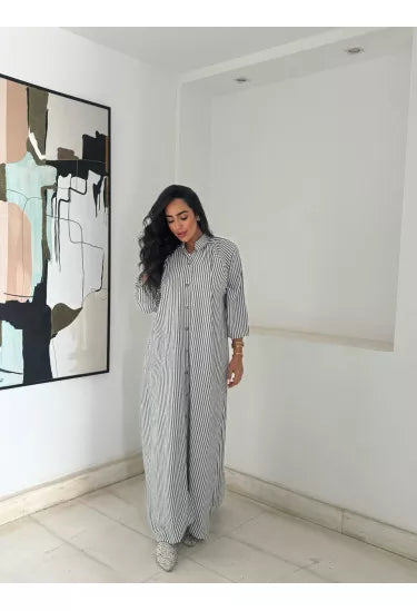 ارتقي بإطلالتك اليومية مع هذا الدريس الواسع المستوحى من الأناقة الإسبانية. تصميم قميص طويل بأزرار أمامية كاملة يتيح لك ارتداءه كفستان محتشم أو كعباية خفيفة فوق بنطال، بينما تضفي الخطوط الطولية الدقيقة مظهراً انسيابياً يطيل القوام ويبرز أناقتك بلا مجهود. الخامة براد قطنية-كتانية خفيفة تتنفس مع حرارة الصيف وتمنحك إحساساً منعشاً طوال اليوم.