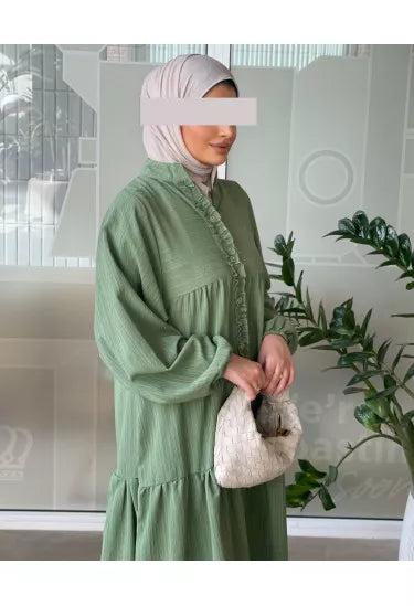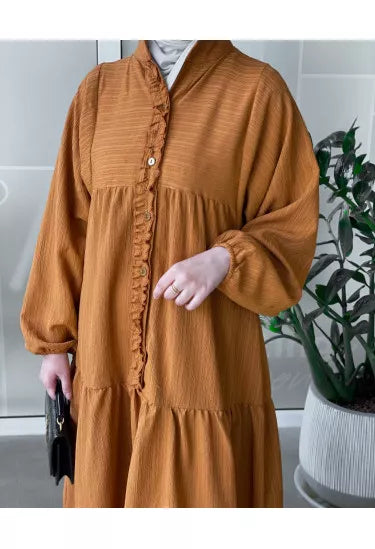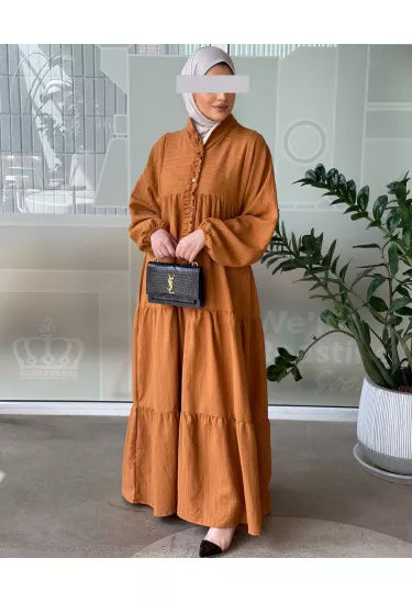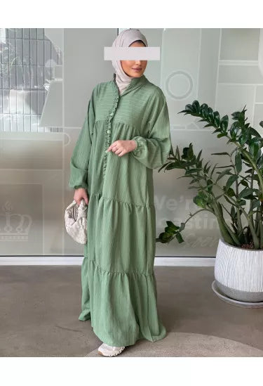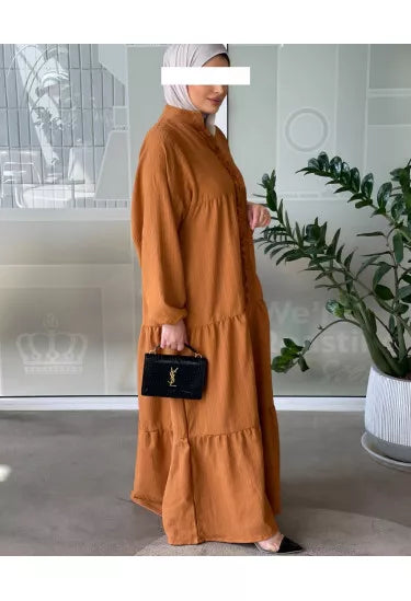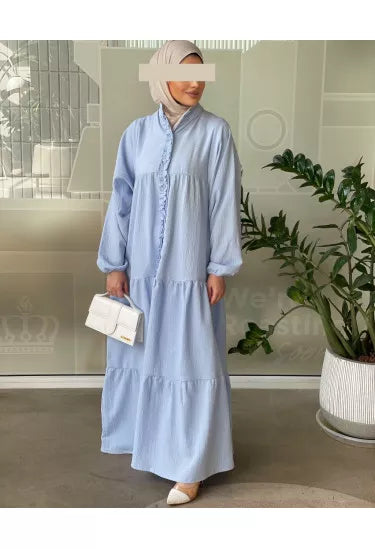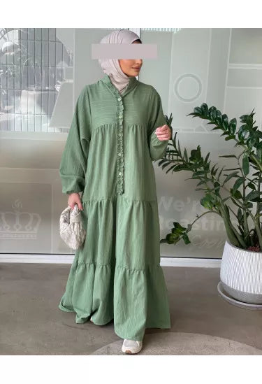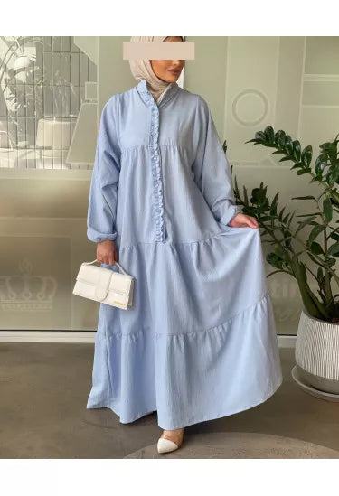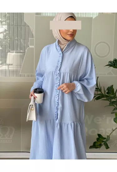 استمتعي بإطلالة صيفية ناعمة ومريحة مع هذا الفستان الكتان الصيفي المصنوع من قماش خفيف وبارد يمنحك راحة طوال اليوم مع لمسة أنثوية راقية. يأتي بتصميم طويل وفضفاض بأكمام منفوخة وتفاصيل أنيقة مثل الأزرار الأمامية والكشكشة الناعمة على الصدر، مما يضيف للفستان طابعًا بسيطًا لكنه لافت.