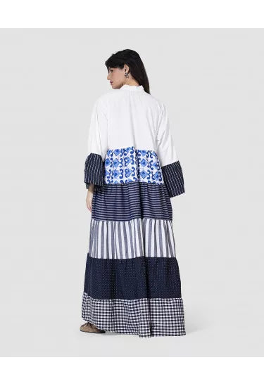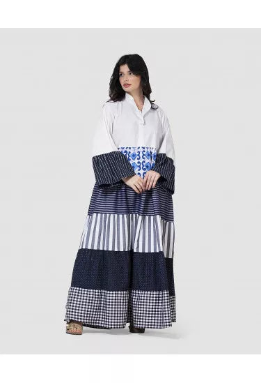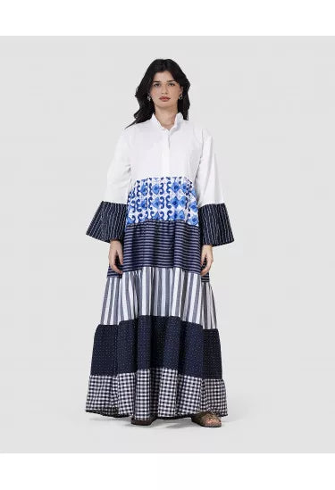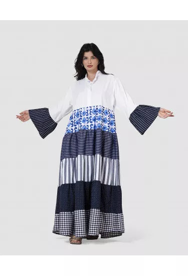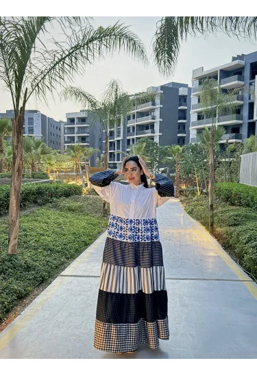 تميزي بإطلالة أنيقة ومريحة مع هذا النفنوف الأدوار المصمم بستايل متدرج يجمع بين البساطة والتفاصيل الغنية. يتميز التصميم بتقسيمات واضحة في الأقمشة، حيث تتغير النقشات والخامات بين كل طبقة بأسلوب مبتكر يجذب الأنظار ويعكس ذوقًا فنيًا راقيًا.