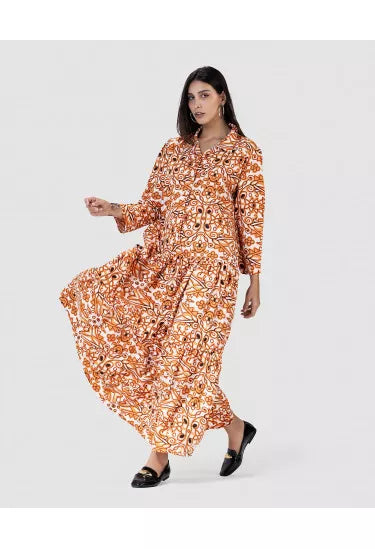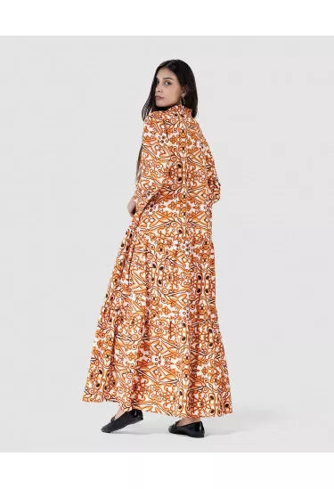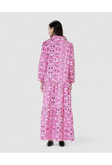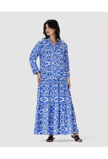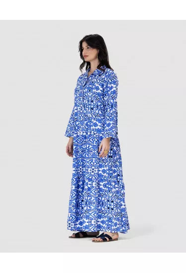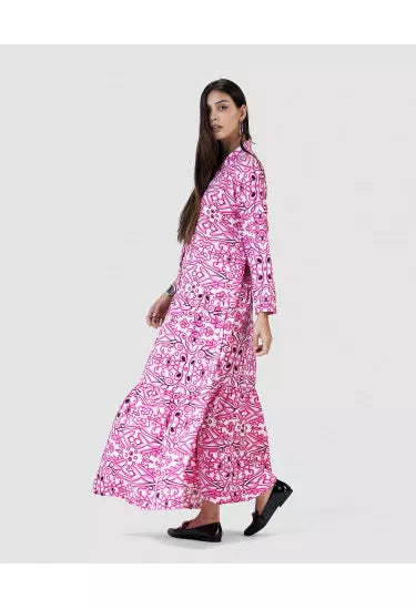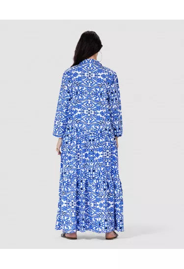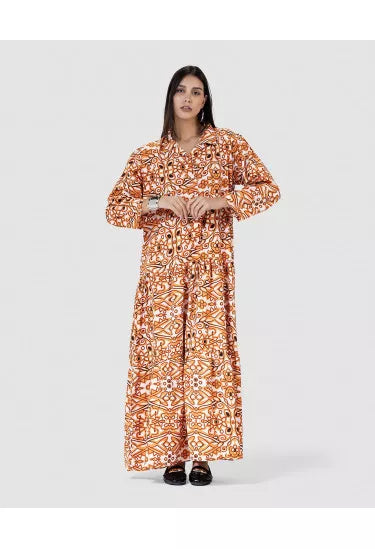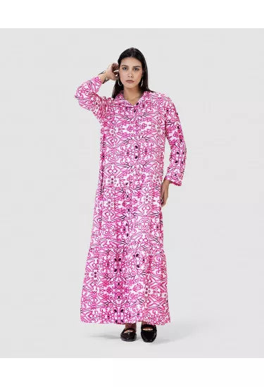 تميّزي بإطلالة ساحرة مع هذا النفنوف الأنيق المصنوع من خامة خفيفة وناعمة، والمزيّن بنقشة هندسية متكررة تمنحك مظهر فريد وعصري مستوحى من الزخارف الشرقية. القصة الفضفاضة والانسيابية تضمن لك الراحة التامة، في حين تضيف الأزرار الأمامية والياقة الكلاسيكية لمسة رسمية ناعمة.